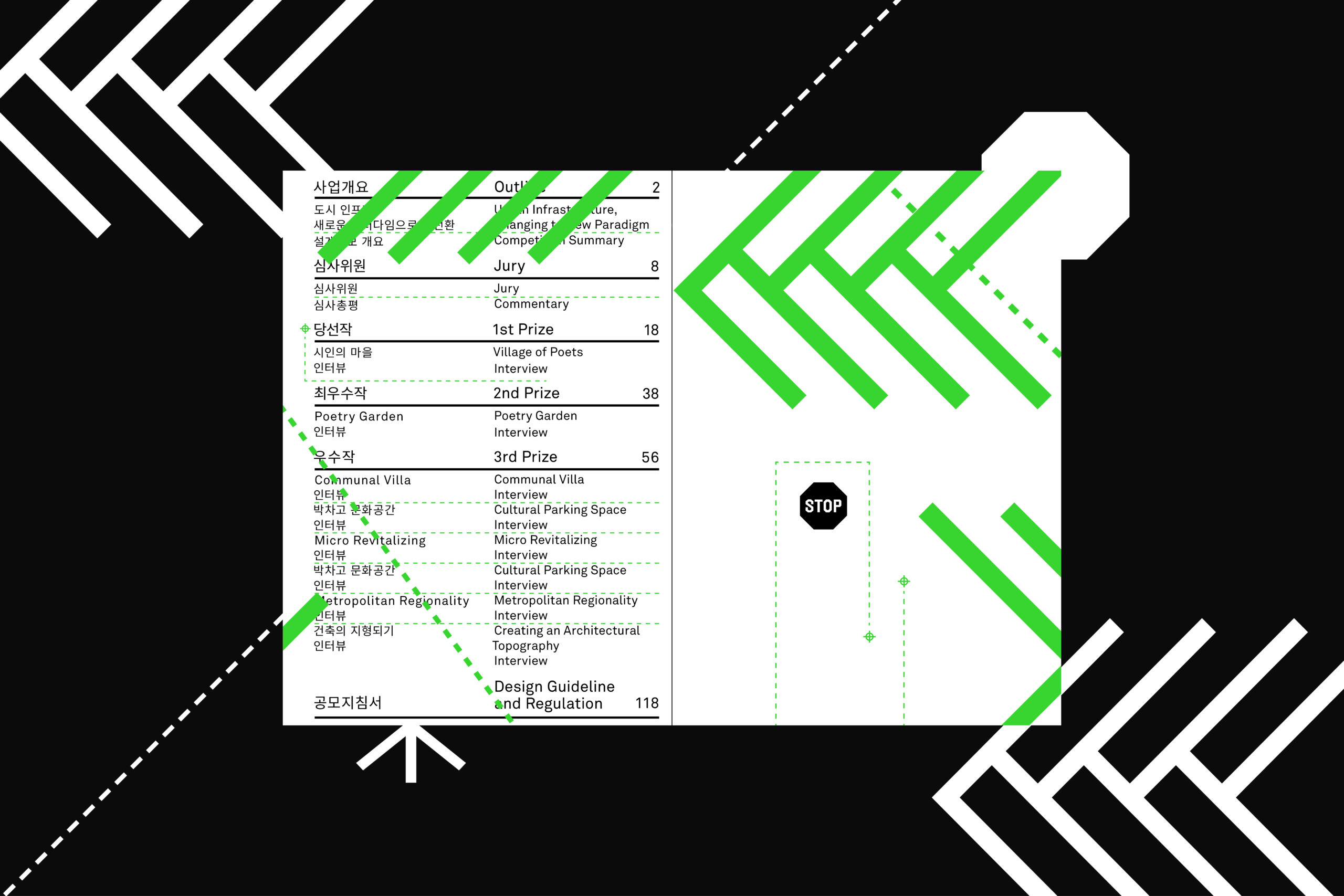 We designed stencil-like typeface and icons to highlight two important parts of the design competition: that the Competition is targeting young architects and that the site was a public facility.