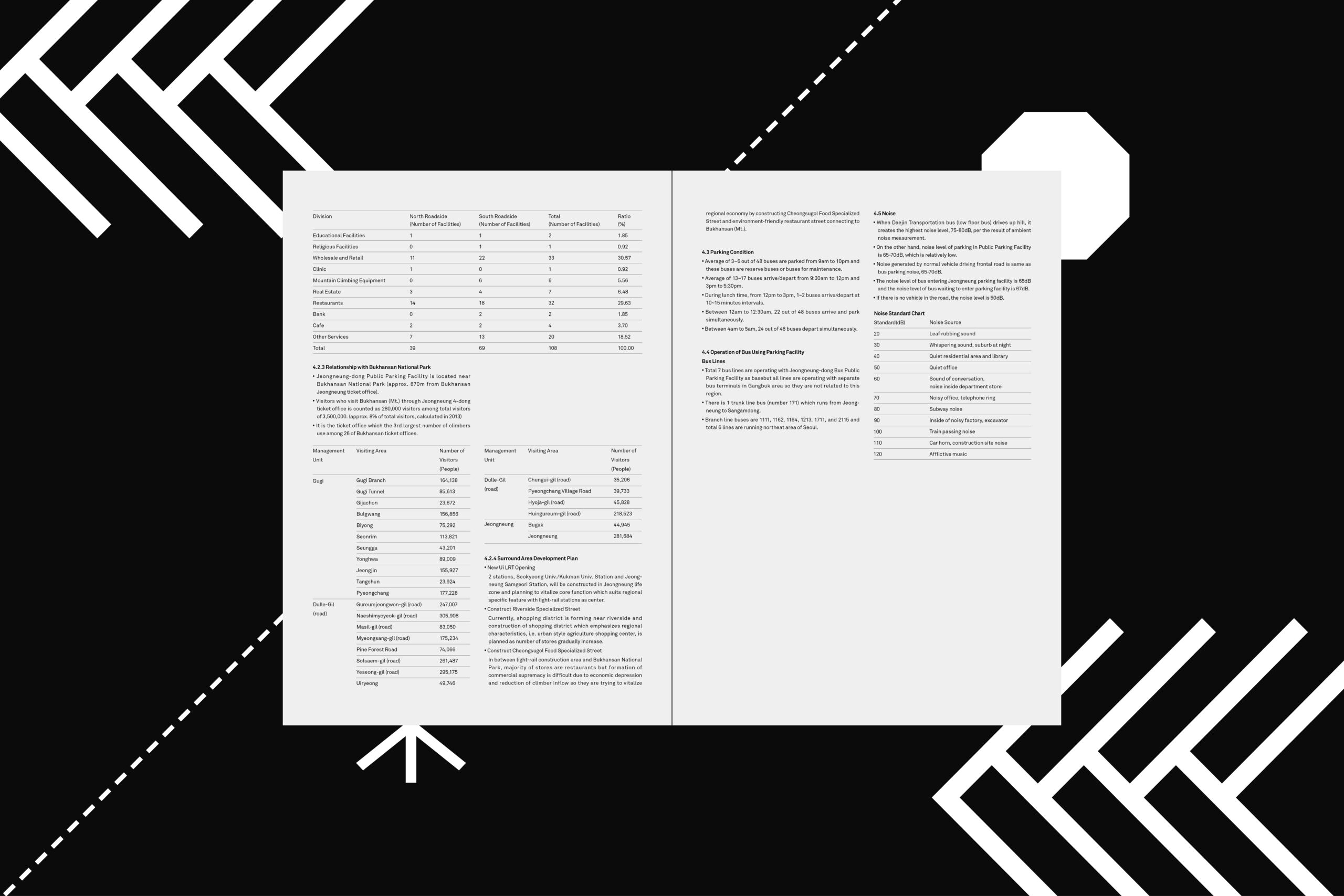 Jeongneung-dong bus public parking facility is located near mountain area and adjacent to dead-end of road. This reveals typical characteristics of residential area near city boundary. Dead-end of the road is commercially vitalized as it is the starting point of hiking trail, but it is inevitable for being vulnerable compare to city center as it is geographically isolated from urban public facilities. Innovative idea on accessibility, which considers vertical height as well instead of simply calculating horizontal distance on plane, is required.
